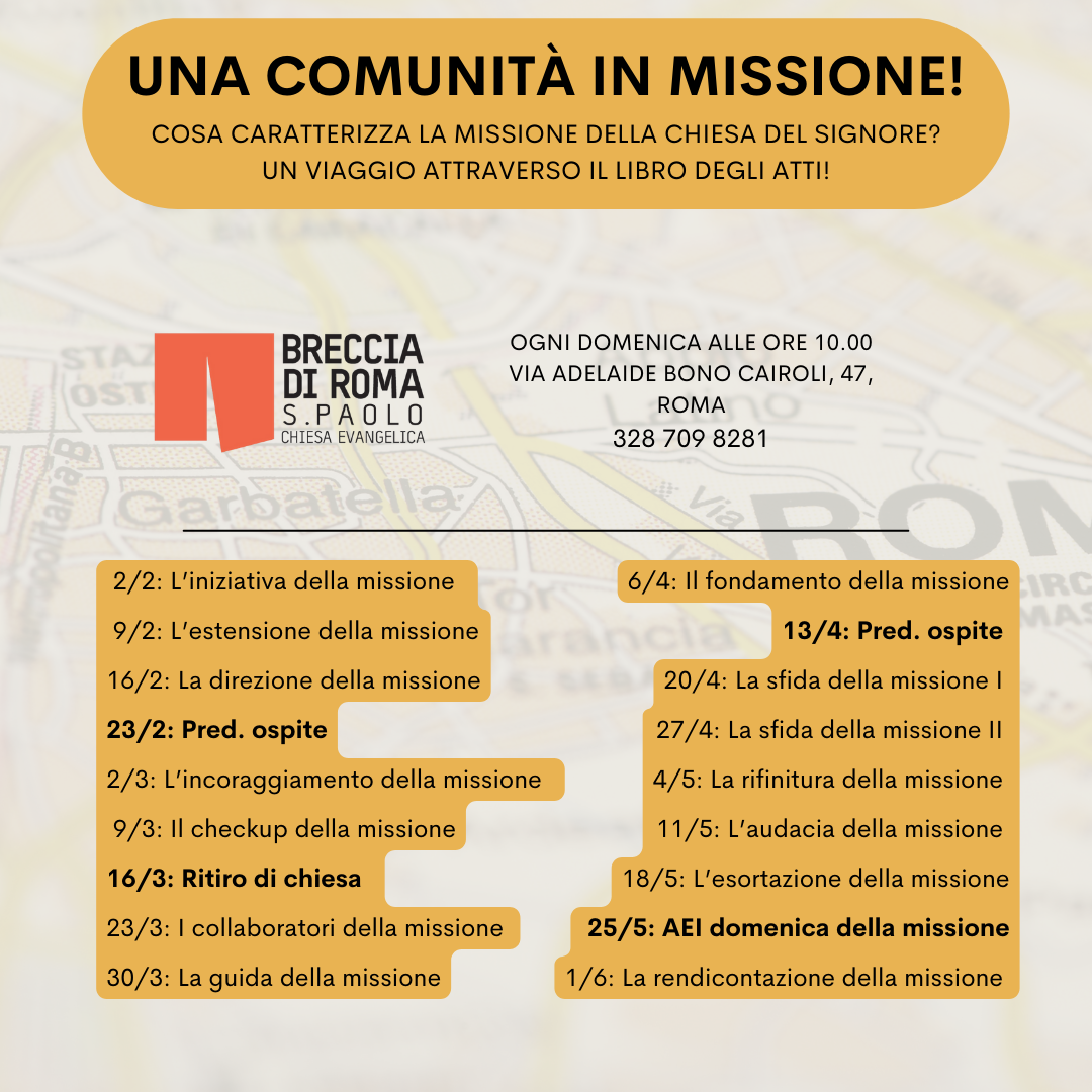La missione della chiesa è guidata da Dio. Da Atti 13 ad Atti 21 - Vediamo una comunità e una missione guidate da Dio (non improvvisando ma seguendo una strategia dettata da Dio, dalla sua sapienza per mezzo dello Spirito Santo - focus sui viaggi missionari di Paolo, sui tratti distintivi della sua opera, sui criteri che l’hanno guidato, sul come si è “mosso” nei meandri del profilo culturale della missione e com’è la relazione con la comunità dei discepoli ecc). Questi capitoli ci porteranno a focalizzarci sul rafforzamento dei doni nella chiesa in vista di una possibile espansione della visione della chiesa e della visione Breccia 2030. Dio è un Dio di ordine così anche la missione della chiesa deve riflettere questo attributo o carattere. Vi sono elementi come doni messi al servizio, programmazione, visione per il futuro, contestualizzazione, sfide da affrontare e opportunità da cogliere. La missione per il regno di Dio ha una sua strategia guidata da Dio: la missione parte da Dio, e da Lui stesso è guidata e sostenuta. Vieni a scoprire con noi cosa la parola di Dio ha da dire in proposito!